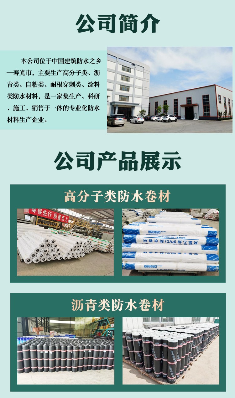 山东银荷防水材料有限公司是集防水材料研发、生产、销售、施工售后为一体的专业化新型防水材料生产企业,主要产品有:pvc防水卷材,sbs防水卷材,高分子防水卷材,自粘防水卷材,丙纶防水卷材等,产品畅销全国,深受用户好评。了解最新产品报价可以联系我们网站 http://www.pvcjuancai.com/ 上电话,我们会第一时间跟您联系。